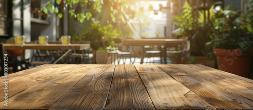 An empty wooden table set against a blurred cafe and bistro background, ideal for product placement.