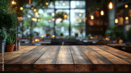 an empty wooden table top with a blurred background
