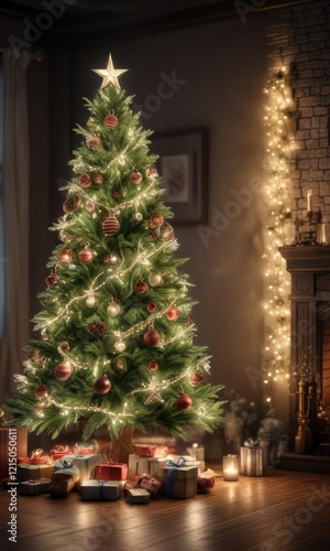 An enchanting Christmas tree adorned with sparkling fairy lights and glittery decorations, twinkling fairy lights, christmas tree, soft glow