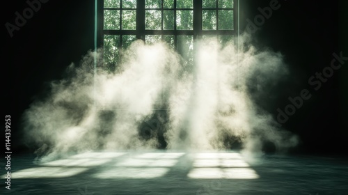 An enchanting indoor scene with gentle mist softly swirling as light streams in from large windows, evoking a dreamlike and peaceful atmosphere.