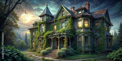 An Enchanting Mansion Covered in Lush Vines Bathed in the Soft Glow of a Full Moon