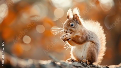 An enchanting orange squirrel sits engrossed in enjoying a nut, with the background beautifully blurred in bokeh style, highlighting the delicate details of the squirrel's fur.