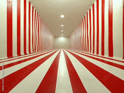 An enclosed room featuring red and white striped walls and floors