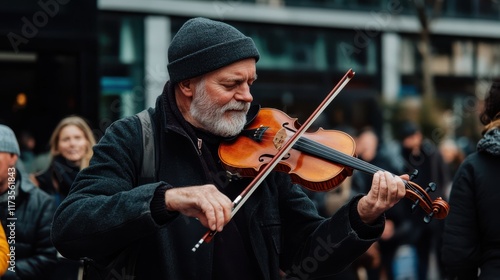 An engaging street musician passionately plays violin for an appreciative crowd.