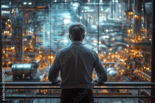 An engineer in a modern factory stands on a balcony, looking at blueprints of the factory and machinery working inside the building.