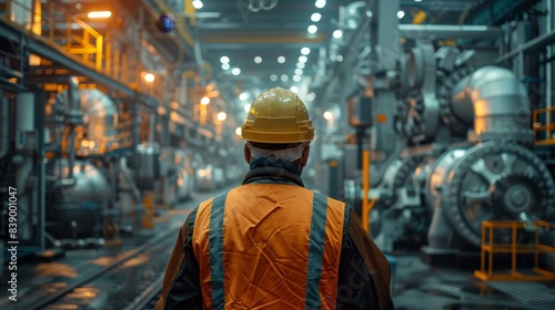 An engineer wearing a hard hat and safety vest inspecting machinery on the factory floor, checking for any signs of wear or damage.