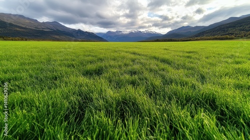 An expansive green field unfolds under a moody sky filled with clouds, creating a dramatic contrast that evokes feelings of freedom and open space, perfect for serene contemplation.