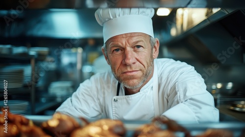 An experienced chef in a bustling kitchen captures the essence of culinary mastery, demonstrating expertise in preparing delicious dishes with passion and dedication.