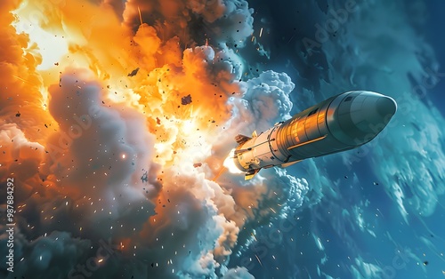 An explosive rocket launch showcasing dynamic flames and smoke against a dramatic sky. Perfect for tech and space themes.
