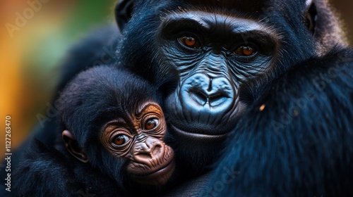 An expressive depiction of a mother gorilla holding her baby close, reflecting comfort and care within the animal kingdom's unique familial relationships in a natural setting.