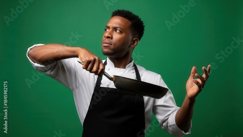 An expressive man in a white chef's coat and apron holding a frying pan with a contemplative look