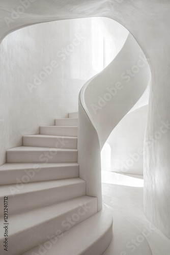 An exquisite white staircase featuring fluid shapes, emphasizing light and shadow dynamics in a minimalist environment.