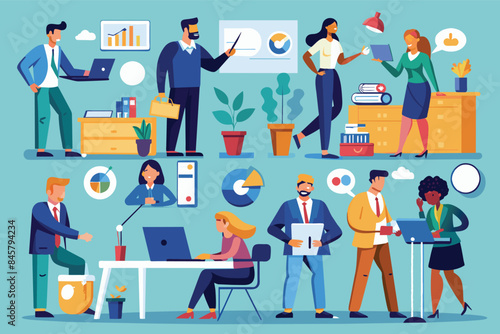An illustration depicting a diverse group of office workers engaged in various tasks, including presenting, discussing, and working on laptops, showcasing a collaborative and dynamic work environment.