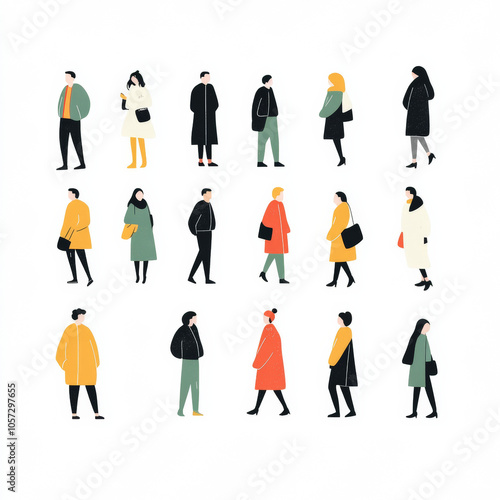 An illustration showing many people, both adult men and women. Very simple 2D vector flat illustration with no background.