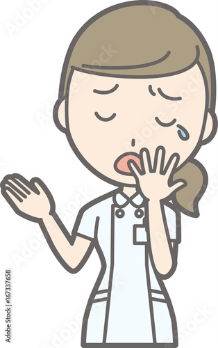 An illustration that a nurse wearing a white suit is yawing