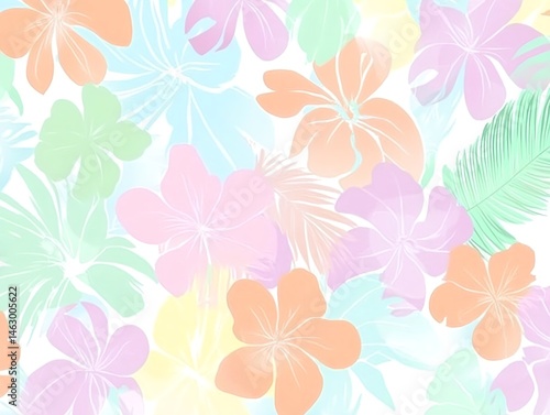 An illustration with white base and soft Hawaiian flowers and palm leaves in pastel tones for a relaxed summer mood