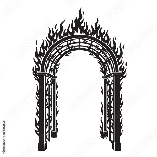 An illustrative vector depicting a burning archway surrounded by stylized flames in black