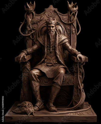 An image of Loki, the Norse trickster god, sitting on a twisted, knotted wooden throne.