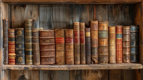 An image of old books on a wooden shelf, showcasing many beautiful retro book covers and skins. The bookshelf serves as a history-themed grunge background, symbolizing concepts of history, nostalgia.