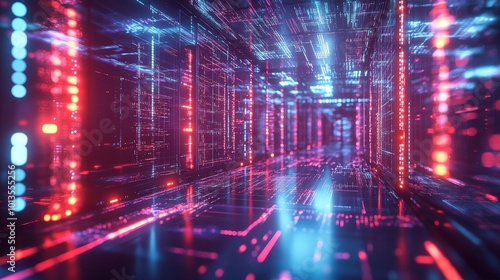 An immersive cyberspace, cloud computing infrastructure, glowing data pulses flow between sleek, metallic nodes in a futuristic tech environment