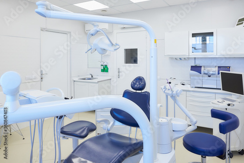 An interior of a dental office with white and blue furniture. Dentist’s office.
