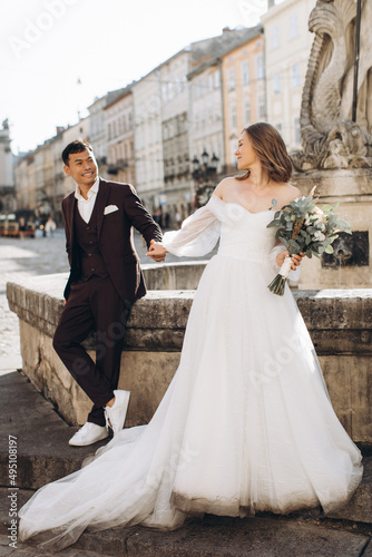 An international wedding couple, a European bride and an Asian groom walk around the city together.