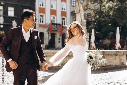 An international wedding couple, a European bride and an Asian groom walk around the city together.