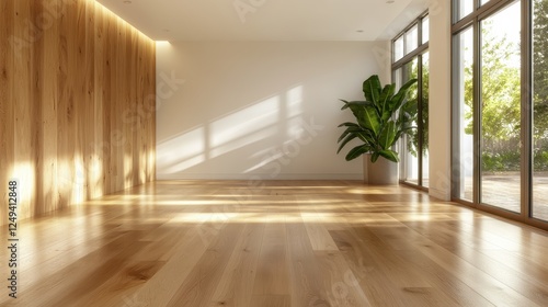 An inviting room showcasing natural wooden flooring illuminated by sunlight through large windows, creating an energetic and refreshing living environment amid plant decor.