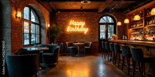 An inviting upscale lounge setting features a warm brick wall adorned with a glowing Happy Birthday neon sign, complemented by comfortable seating and a well-stocked bar