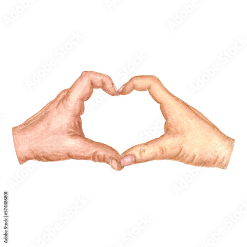 An isolated watercolor image of female and male hands depicting a heart, with a real texture of watercolor paper on a white background for the design of text, labels, greeting and invitation cards