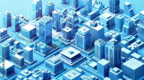 An isometric city tech hub with modern office buildings, innovation centers, and startup spaces, showcasing the city's technological advancements.