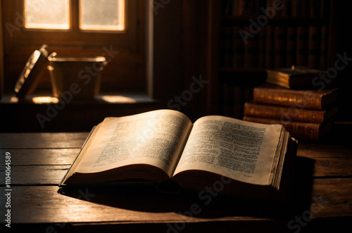 An old ancient open book laying on the dark wooden table in a dim of light. Christianity religion Holy Bible, Gospel, Testament, spiritual literature, sacred text illustration concept.