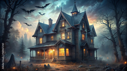 An old, dark castle sits on a hill in a haunted forest at night, with a spooky sky and a moon