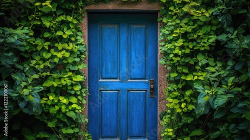 An old wooden door with a blue frame opening into a lush, green world, symbolizing a transition to better environmental conditions and the concept of change