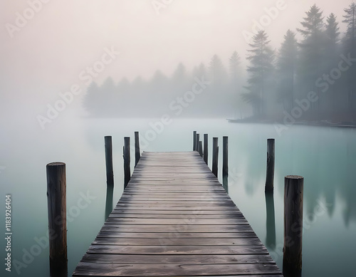 An old wooden pier extending into a foggy lake.