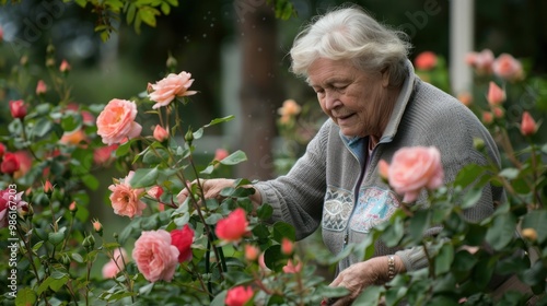 An older adult woman tending to a rose garden carefully pruning and watering the plants