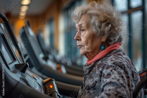 An older woman walks steadily on a treadmill in a sunny gym filled with equipment