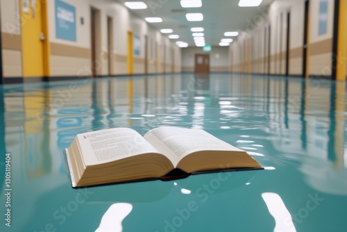 An open book floats on water flooding a long hallway, creating a serene yet surreal scene.
