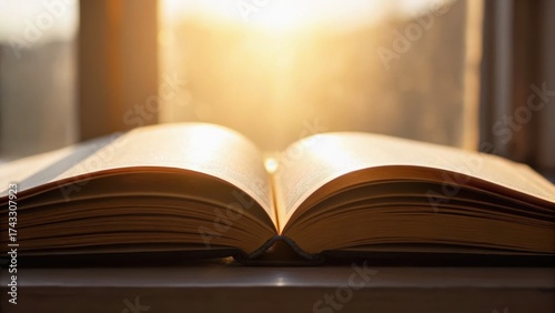 An open book is illuminated by soft sunlight, creating a warm and inviting atmosphere, highlighting the pages and their textures.