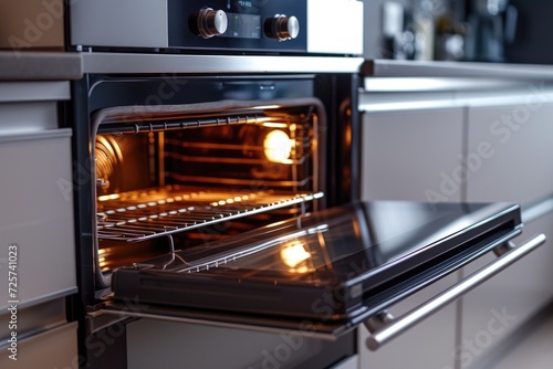 An open oven door in a kitchen. Suitable for cooking and baking concepts