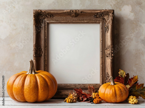 An ornate empty frame surrounded by Thanksgiving-themed decorations like pumpkins and autumn leaves.