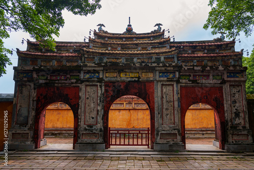 An ornate gate, showcasing traditional Vietnamese architecture, stands within the Hue Historic Citadel.