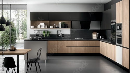 An ultra-modern kitchen featuring sleek plywood cabinets and countertops blends aesthetics with functionality.