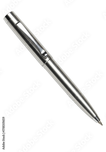 An ultra-modern silver stainless steel ballpoint pen isolated on a white background with sharp focus and metallic sheen. Concept for luxury business advertising