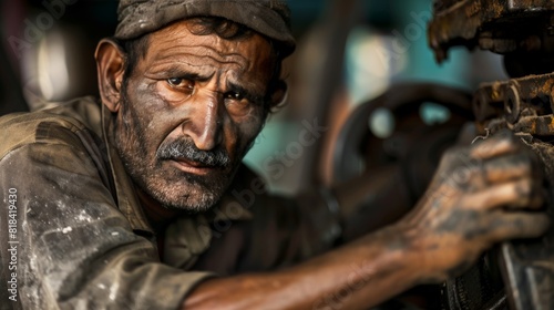 An up-close portrait of a seasoned worker, his hands worn yet skilled, meticulously operating machinery