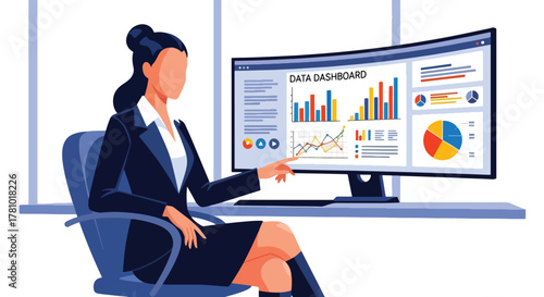 Analyst reviewing dashboard analytics with graphs and charts. Solid vector style, ideal for finance, analytics dashboards, fintech pitches
