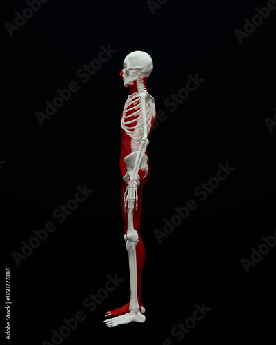 Anatomical skeleton muscle medical study red white human male black background left view 3d illustration render digital rendering