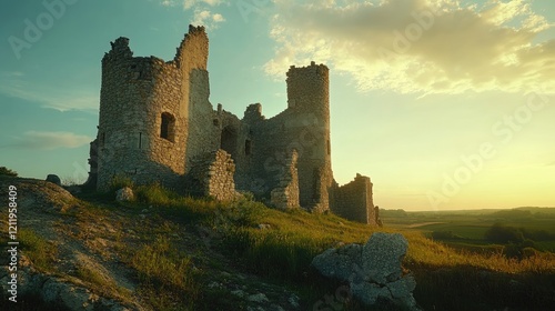 Ancient castle ruins bathed in warm sunlight showcasing timeless beauty and nature's reclamation during a serene summer day