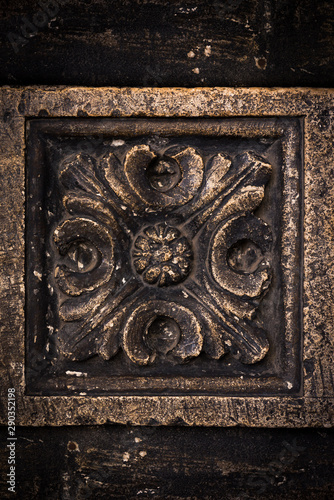 Ancient columns with Renaissance bas-reliefs and plants patterns in the wall