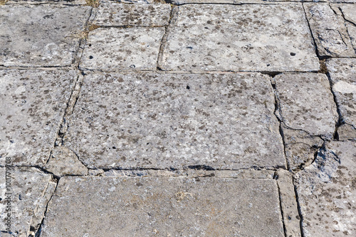 Ancient court lined with stone slabs covered with lichen
